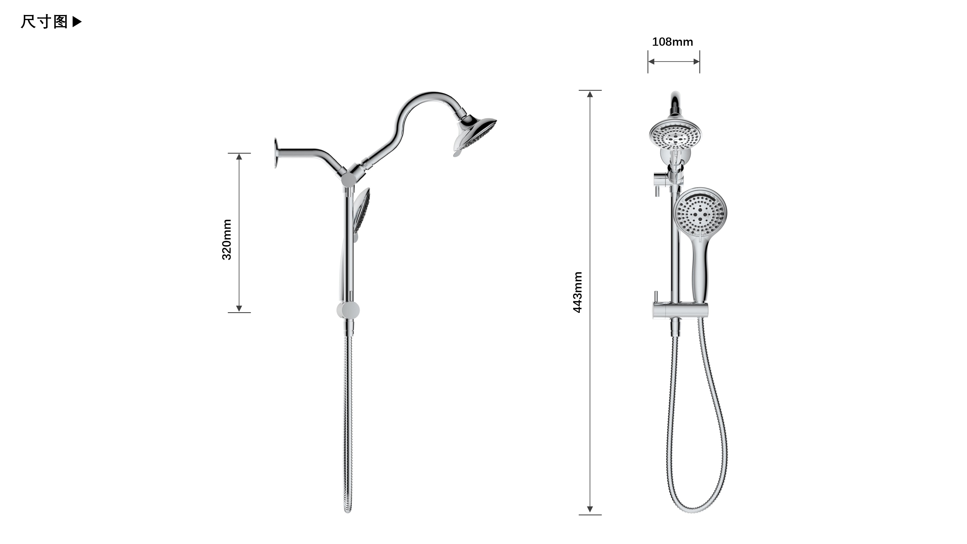 上出水彎管套裝;頂噴內置球頭,可實現多角度旋轉調整;把手切換頂噴出水、花灑出水;轉動把手調節(jié)滑座高低;帶瀑布水5功能花灑